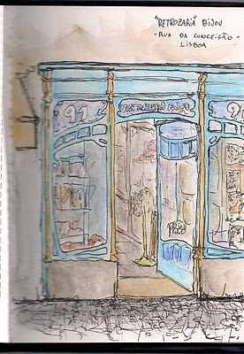 Juntei-me aos Urban Sketchers Portugal (mais de 100) no passado dia 9. O objectivo foi desenhar todas as fachadas e vistas entre quarteirões da Rua Augusta. A mim calhou-me a vista entre o 3º e 4º quarteirão (do lado virado para o castelo) a que corresponde a Rua da Vitória.